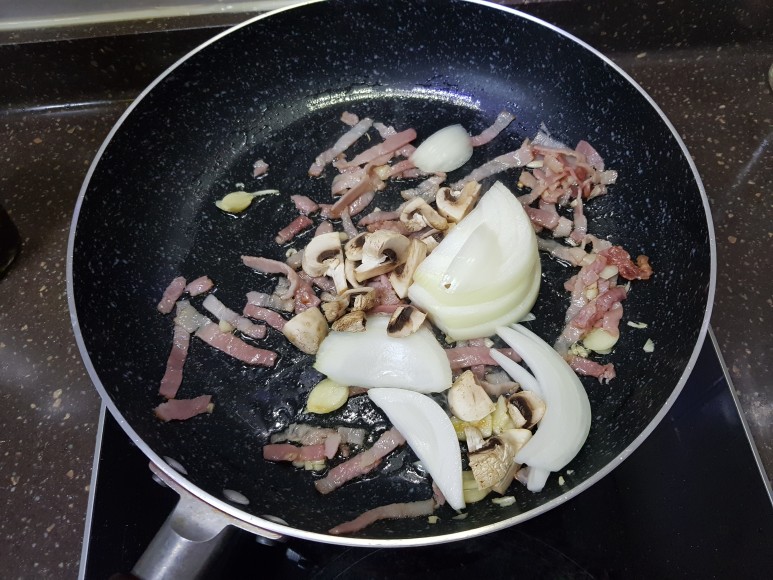 베이컨이 원하는 만큼 구워지면 나머지 재료를 넣어서 볶아주세요!