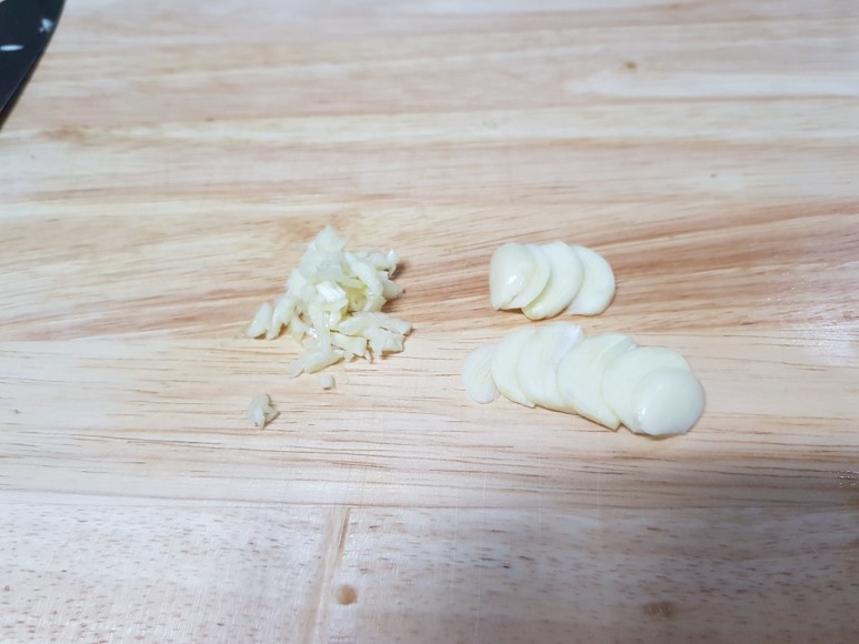 마늘은 4개만 썼어요! 2개는 다졌고, 2개는 편마늘로 썰었어요!!
