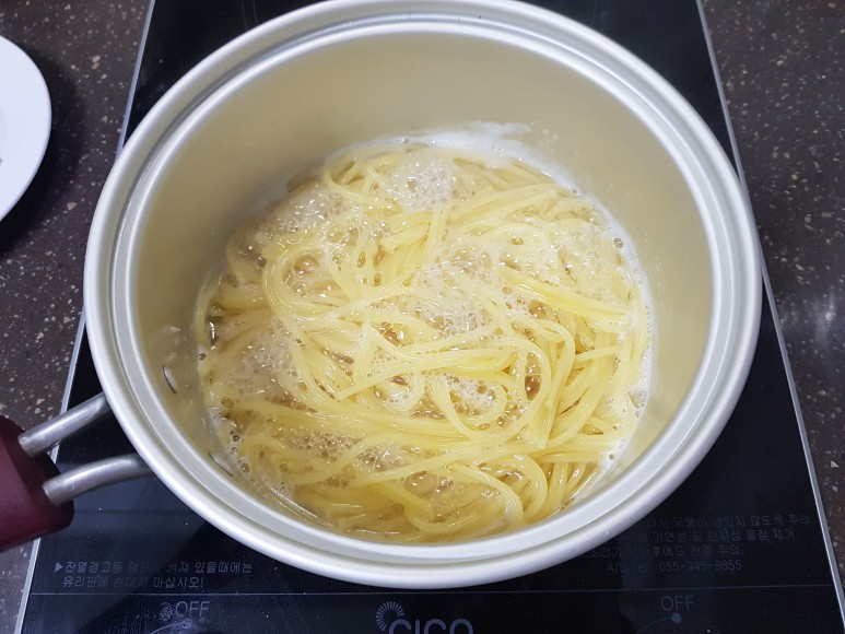 만약 재료 준비가 좀 늦어서 면이 다 익었으면, 면을 건져서 올리브유를 섞어서 접시에 보관해주시면 됩니다.