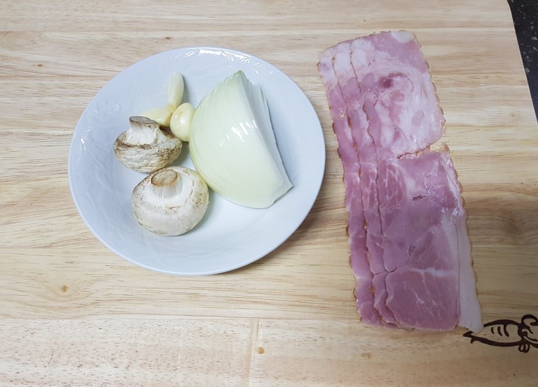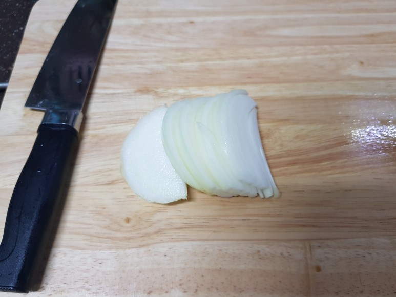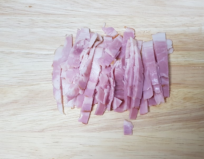 베이컨은 위에서 보신 바와 같이 3장 사용했어요. 얇게 썰어줄게요!