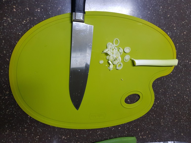 파에서 흰뿌리 쪽을 썰어줍니다. 파기름 내줄거에요.