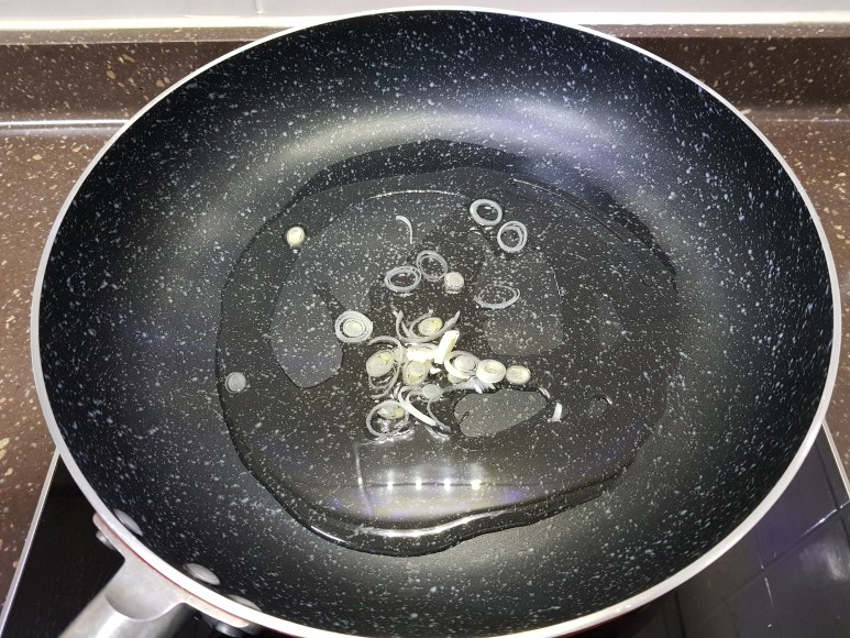 프라이팬에 기름 두르고 불 킨 후 바로 썰어둔 파를 넣어주세요.