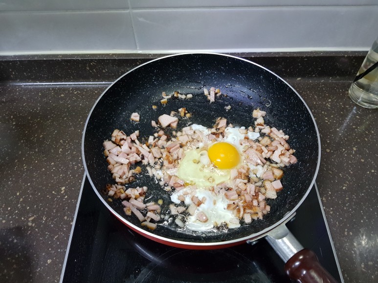 적당히 익을만큼 볶아준 후에 계란을 깨서 넣어주세요.