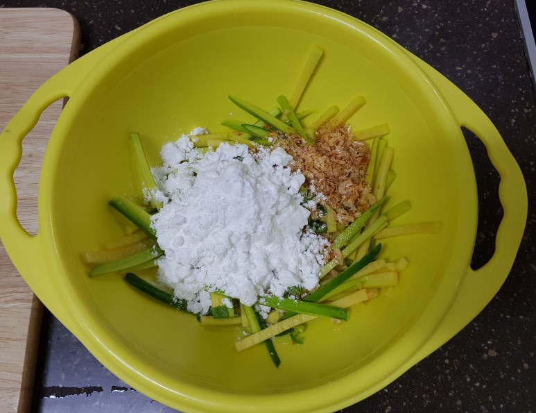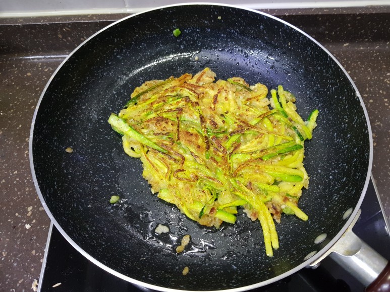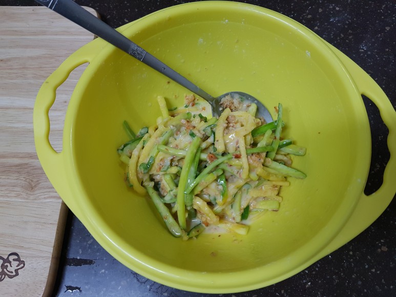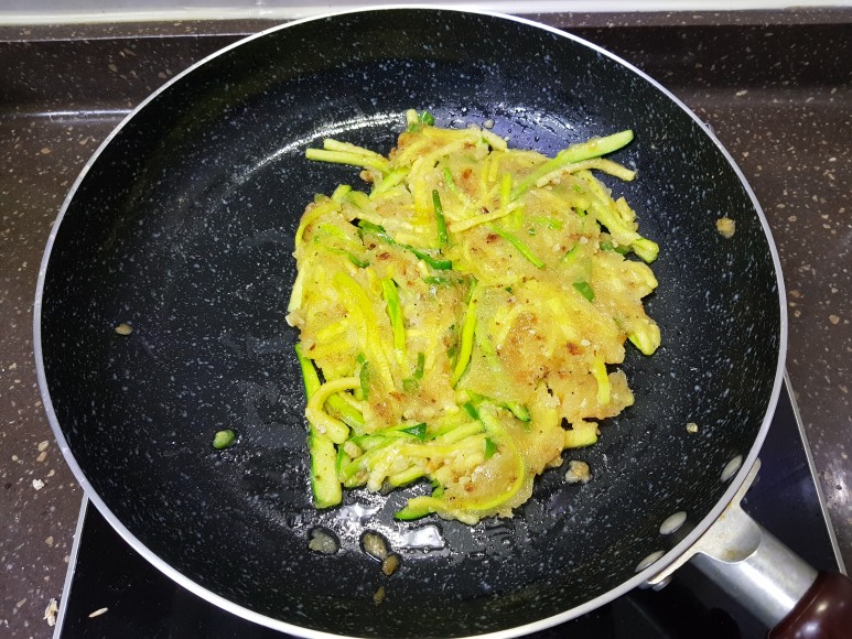 애호박에 소금을 뿌렸기 때문에 애호박에서 수분이 나와 딱히 물을 첨가하지 않아도 반죽이 된다.....고 하셨는데 안되더라구요? ㅋㅋㅋㅋ 그래서 물 좀 섞었습니다. 여러분도 상황 보고 그렇게 하세요!
