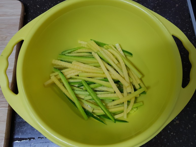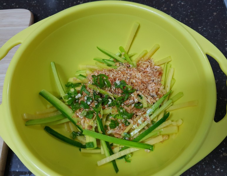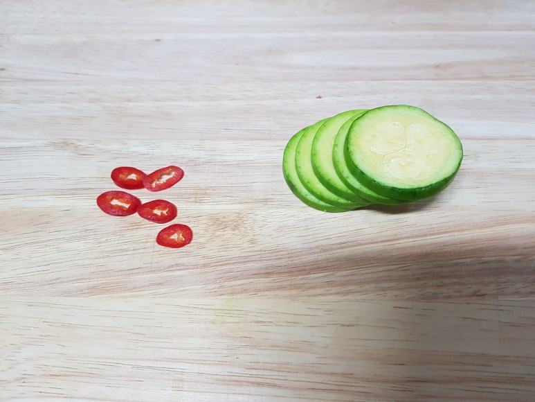애호박은 얇게 채 썰었고 청양고추도 잘게 다졌어요.