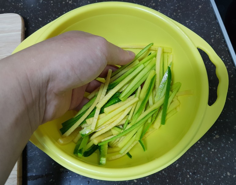애호박에 소금을 살짝 뿌려서 잠깐 놔둬주세요. 애호박에 간을 해주고 수분을 빼내기 위함이에요.