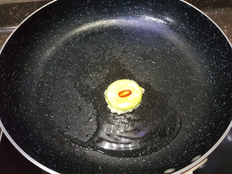 프라이팬에 기름을 두른 후, 불을 켜서 잘 달궈지면 애호박을 올려주세요. 불은 중간불로 했어요.
