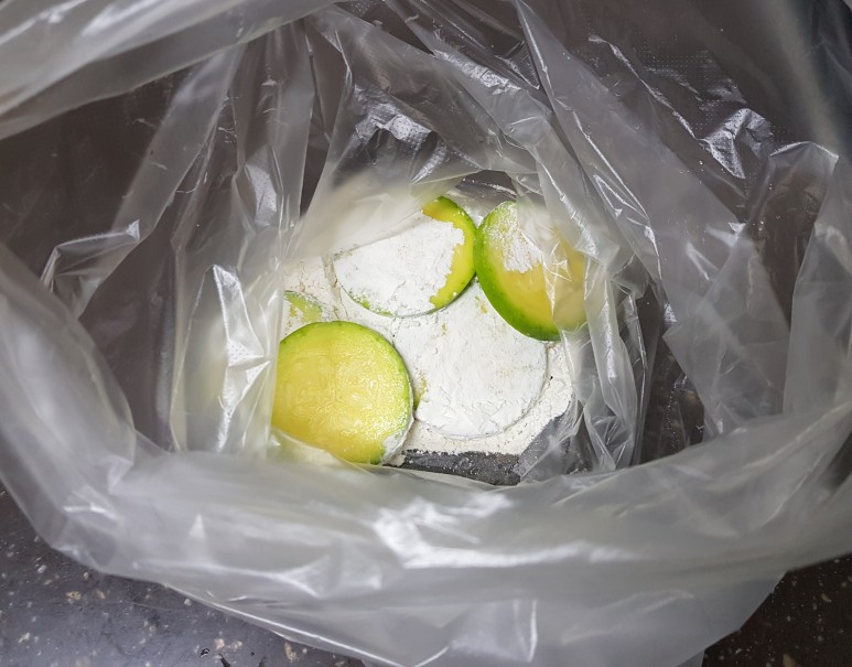 비닐봉지에 밀가루를 적당량 담은 후 애호박을 한 개씩 넣어주세요. 서로 달라붙지 않게요!