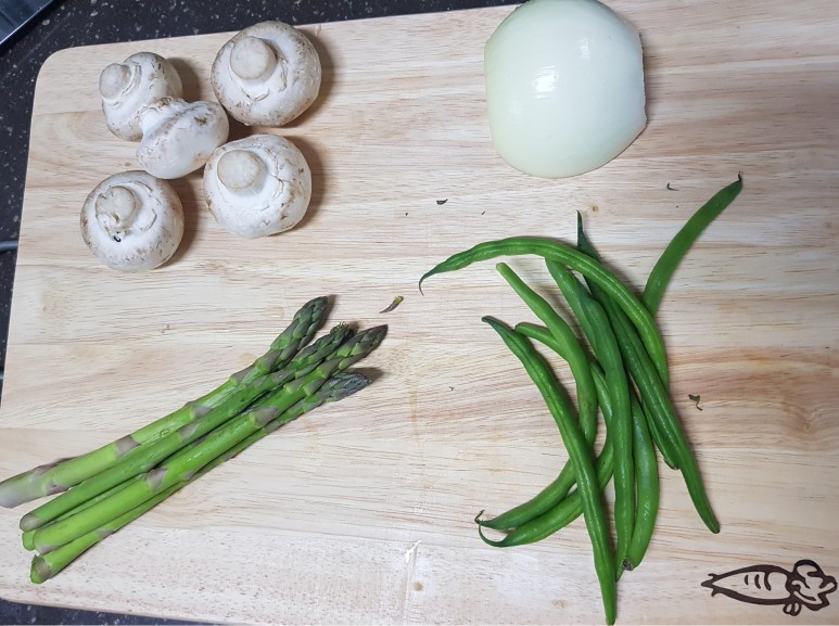 버터의 풍미와 바질. 그리고 후추의 풍미가 양송이와 아스파라거스에 정말 잘 어우러져서 입 안이 즐거워지는 맛이에요. 양파와 그린빈스도 두말할 것 없이 훌륭한 맛이구요.