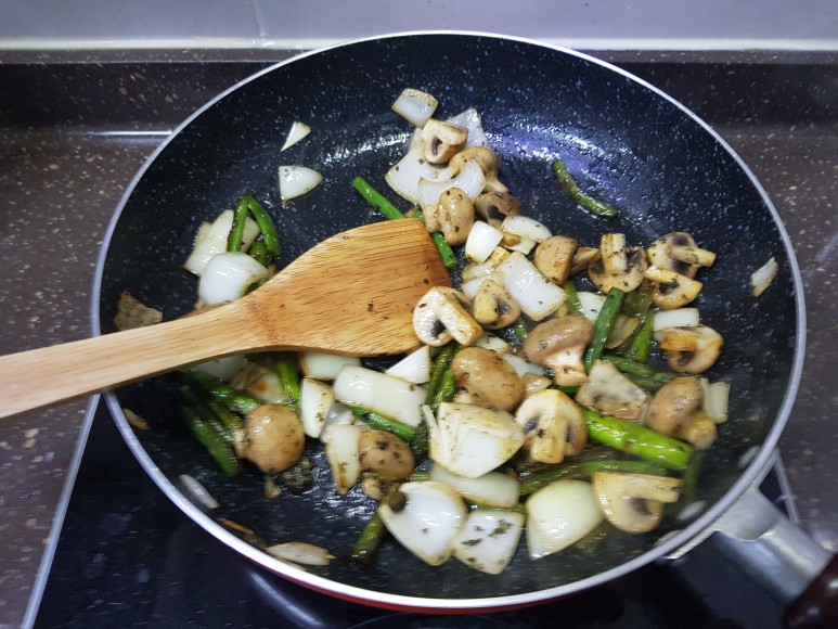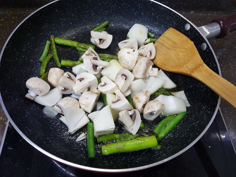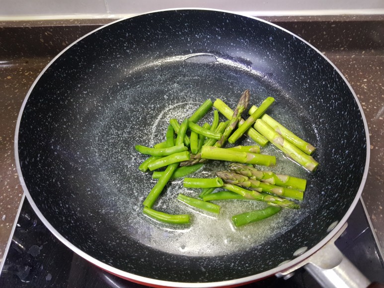 아스파라거스가 다른 재료에 비해서 잘 안익어서 먼저 볶아주는 거에요.