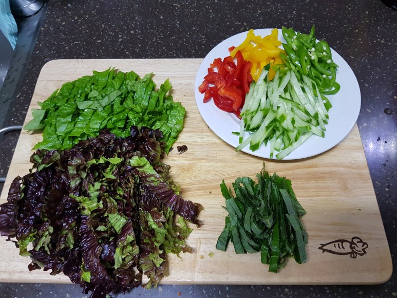 보이시는 것처럼 쌈채소로 청상추, 적상추 샀던 거를 잘게 썰어줬어요.