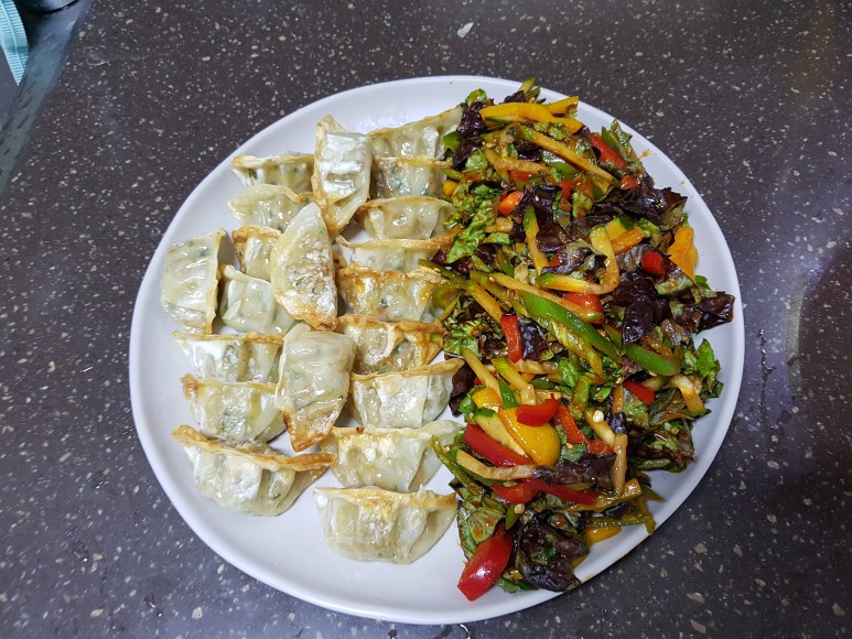 납작만두가 제일 잘 어울리지만, 교자만두도 만두피 맛이 많이 나기 때문에 비빔채소랑 잘 어울리는 것 같아요.